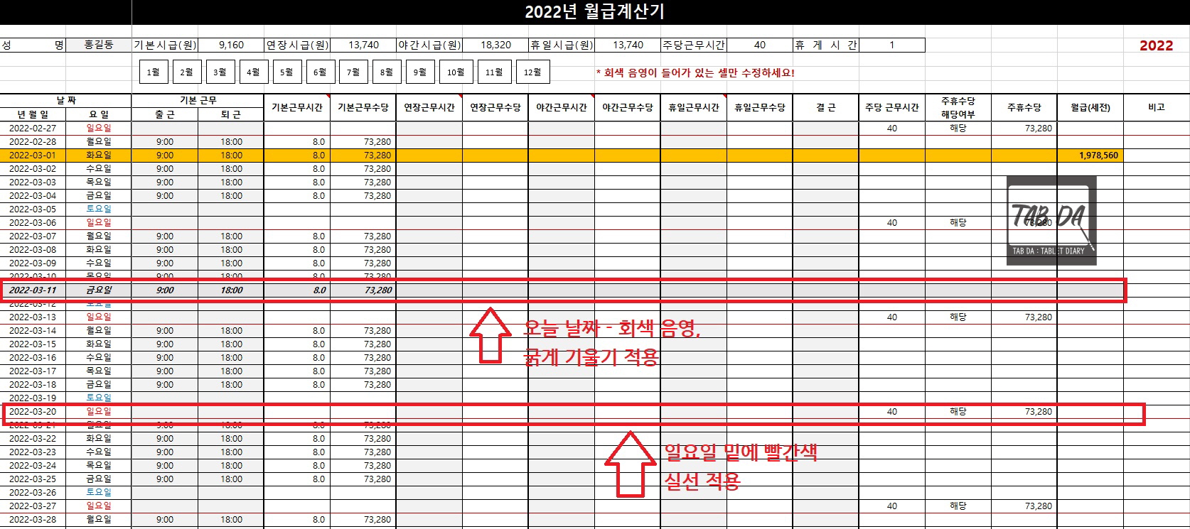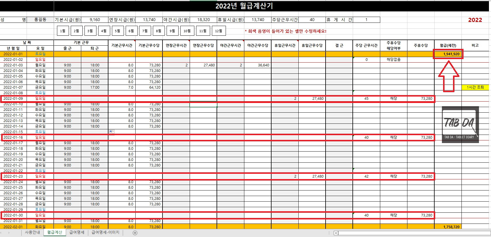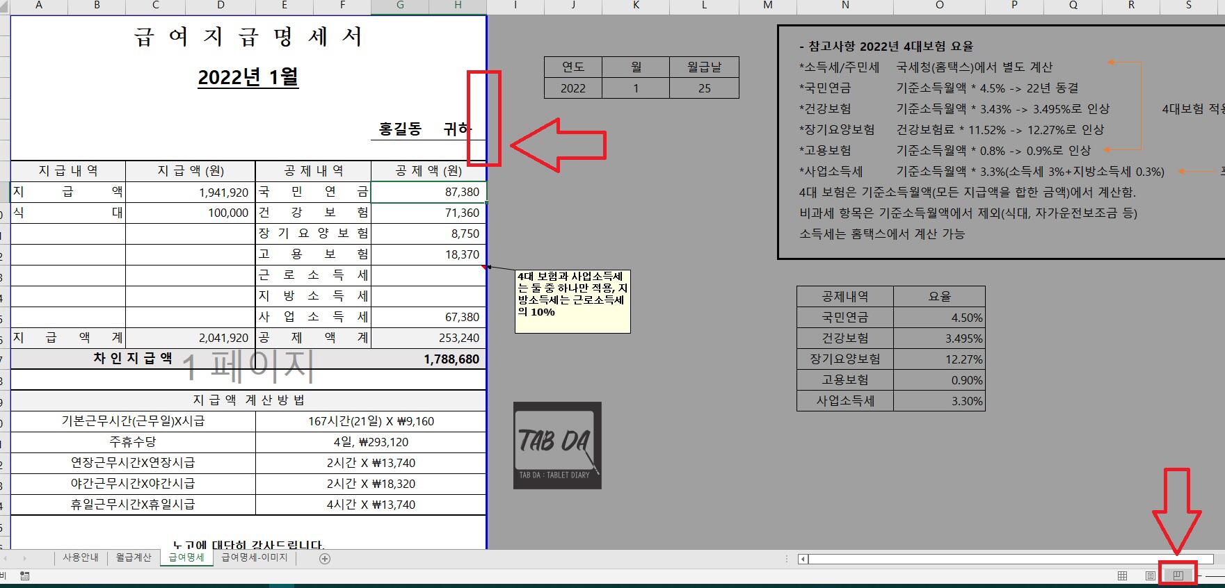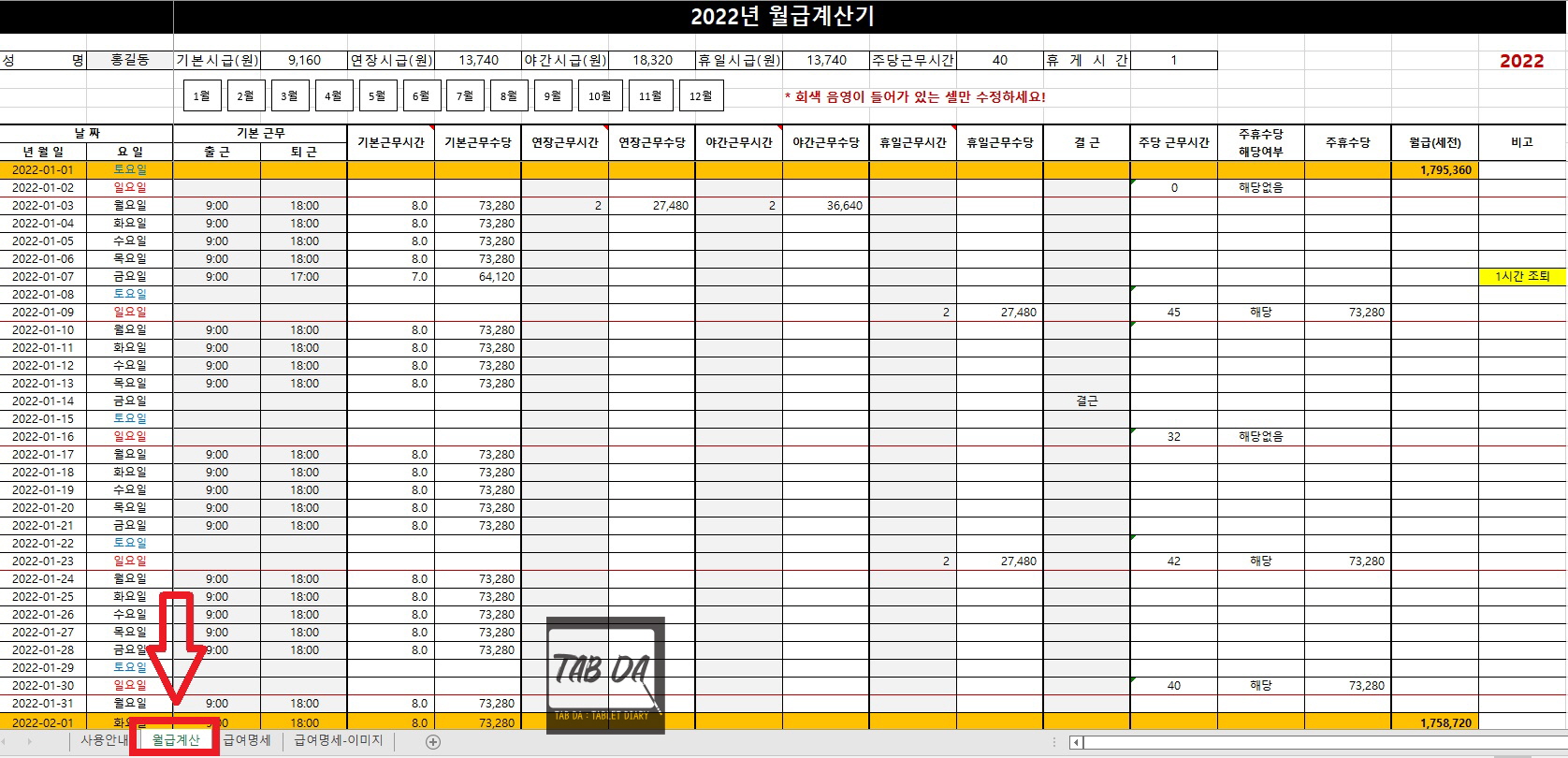 2. 월급계산 시트 - 이용 방법