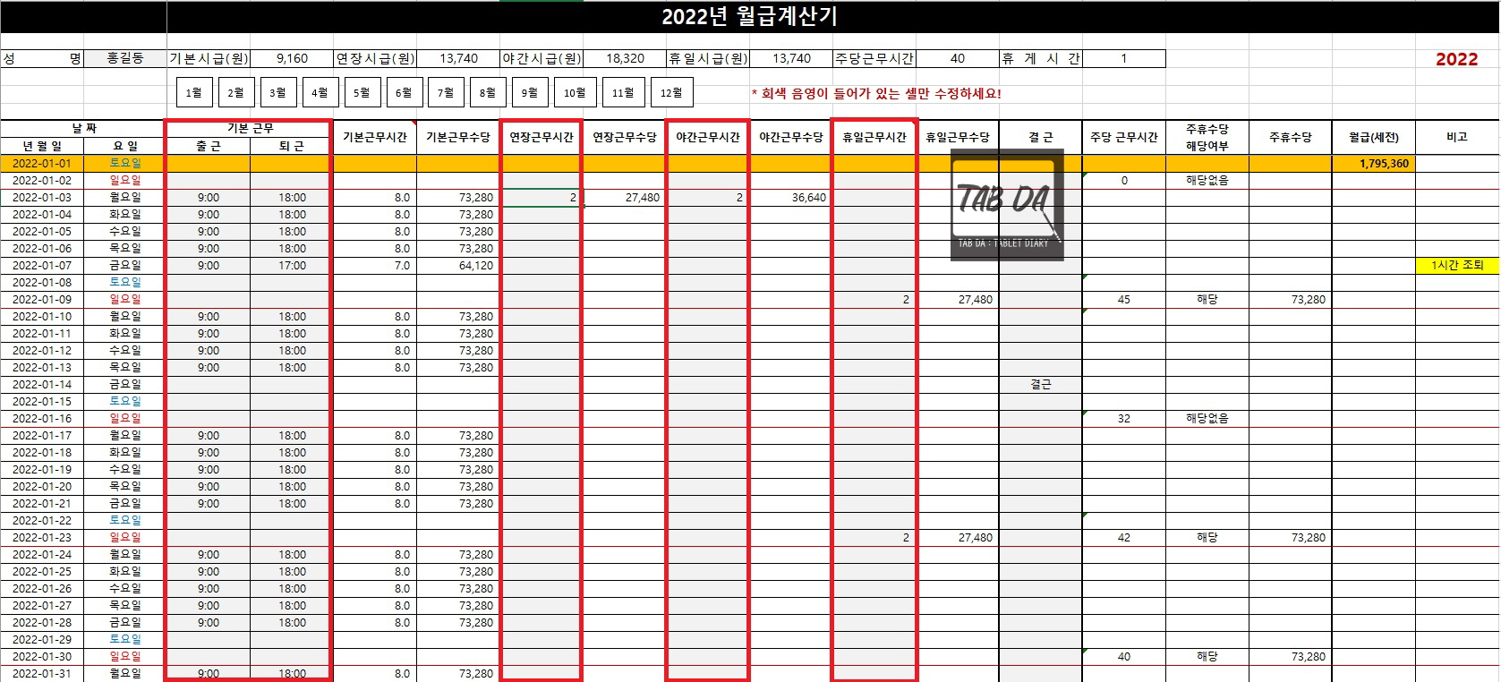그리고 출, 퇴근 시간과 근무 시간은 회색으로 음영이 들어간 셀에만 작성해주세요. 나머지 셀에는 수식이 들어가 있어서 자동으로 계산돼요.
