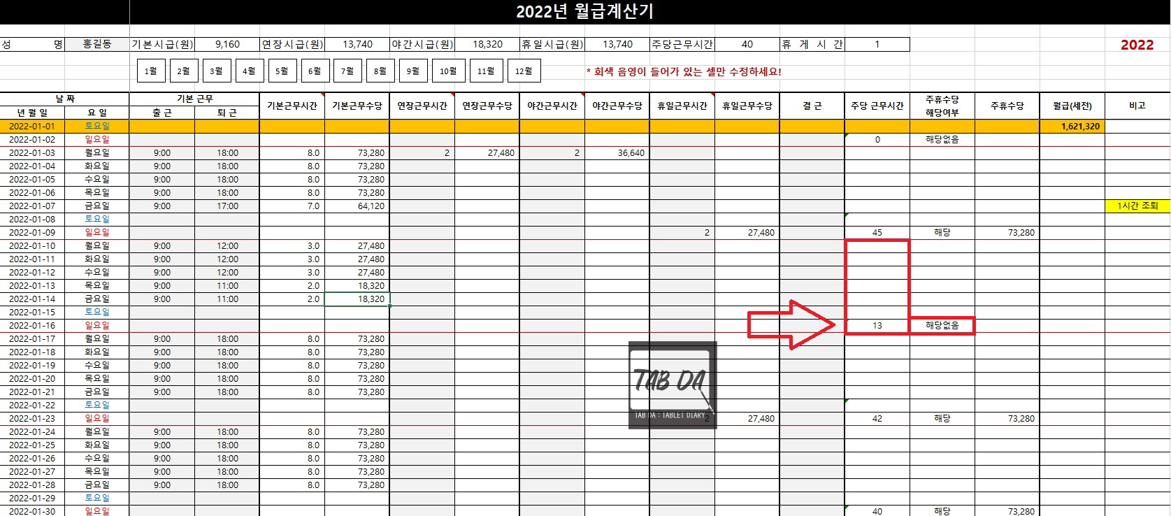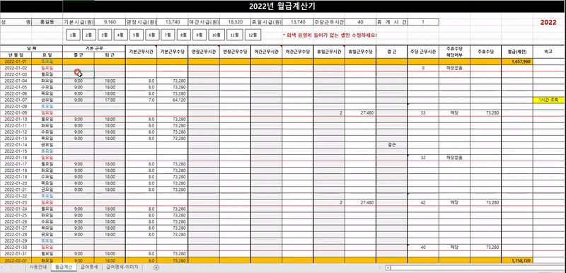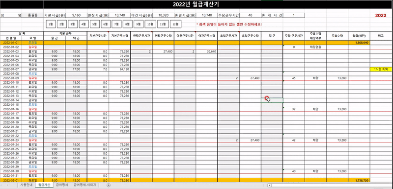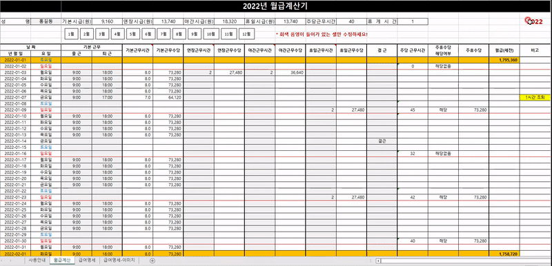주의❗❗ 본 파일은 근무 시간을 토대로 월급 계산을 편하게 하기 위한 "참고용" 엑셀 양식입니다. 개인적으로 만든 파일이라 현행법을 제대로 반영하지 못 할 수 있으므로 본 양식이 월급 계산의 법적 근거 또는 절대적 기준이 되지 않음을 명시합니다. 본인의 책임에 따라 사용하시길 바랍니다. :)
