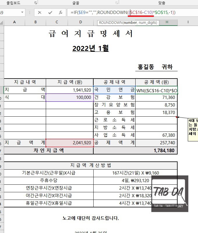 여기서 공제내역 작성시 유의해야 할 점이 있어요. 식대, 자가운전보조금 등 비과세(세금을 부과하지 않음) 항목은 공제 내역 계산 시에는 제외해야 한다는 거예요. (4대보험 취득신고시에도 보수월액에서 비과세 항목은 제외함) 비과세까지 설명하려면 글이 너무 길어져서 해당되시는 분들은 참고해서 지급 합계를 수정해주세요. 위 수식에서 $C$16이 지급합계이므로 여기에서 비과세 항목만 빼주시면 돼요. 비과세 지급내역이 없으면 신경쓰지 않으셔도 됩니다.