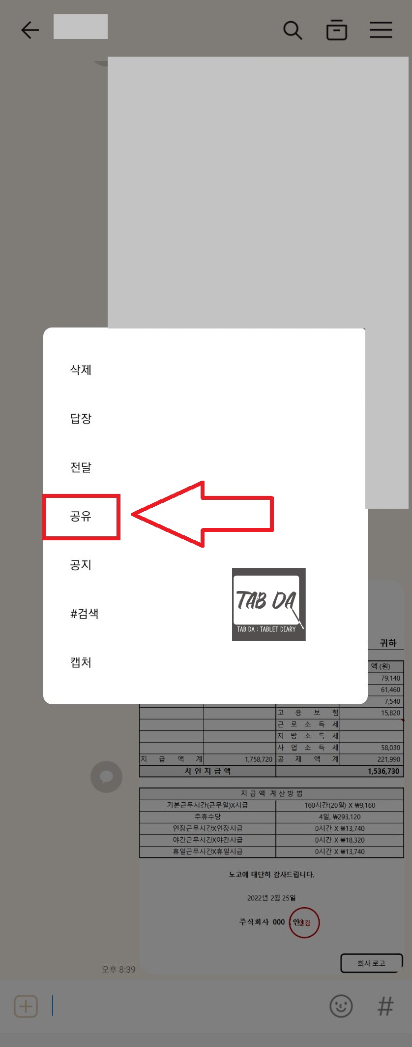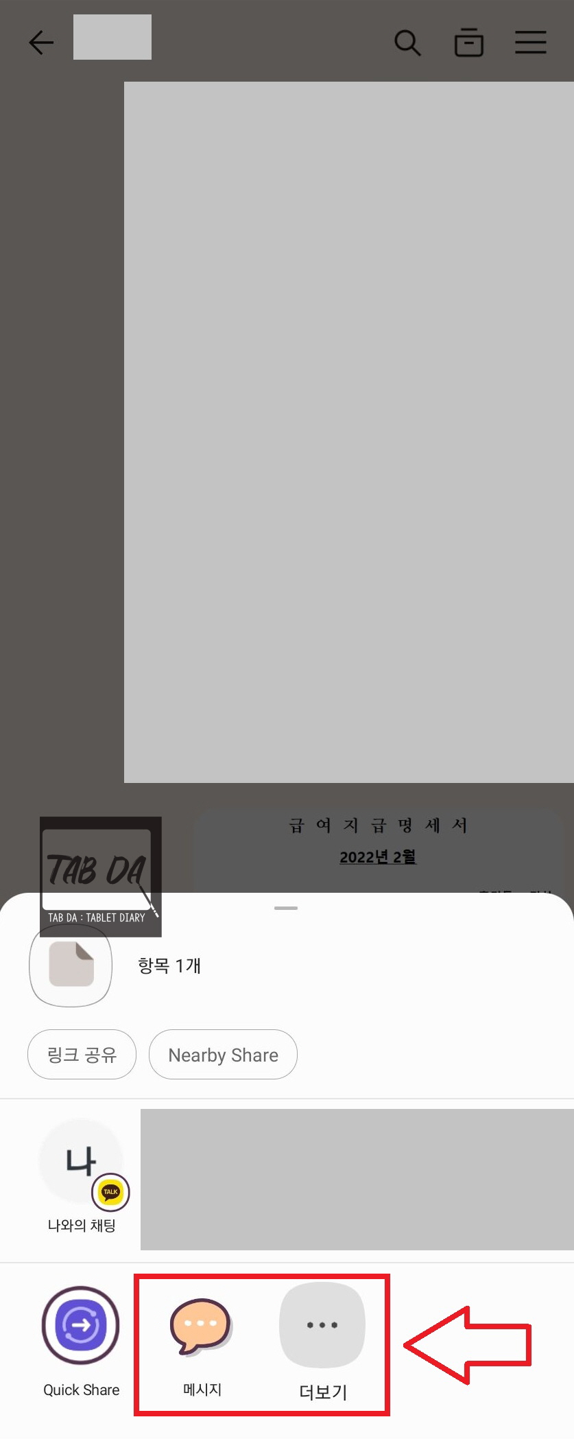 카톡이 아닌 문자로 전송하고 싶다면 같은 방식으로 먼저 PC카톡에서 나에게 보내기(나와의 채팅)를 해주세요. 그런다음 핸드폰 카톡에서 나와의 채팅창을 보시면 이미지가 보내져있겠죠. 해당 이미지를 꾹 누르면 뜨는 메뉴에서 공유를 누르고 메시지를 선택하시면 바로 문자를 전송할 수 있어요. 공유 화면에 메시지가 뜨지 않는다면 더보기를 눌러서 메시지를 찾아주세요. (안드로이드 삼성 핸드폰 기준)