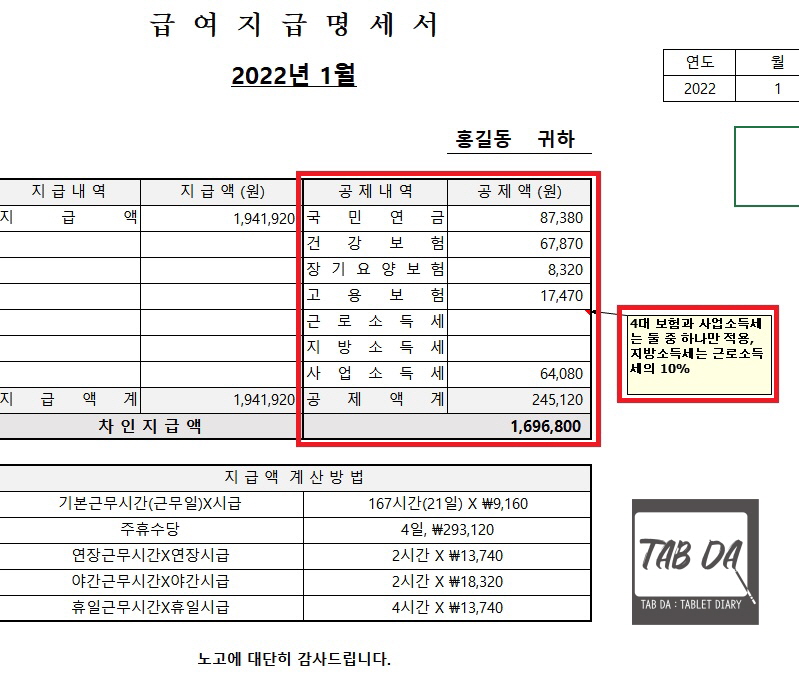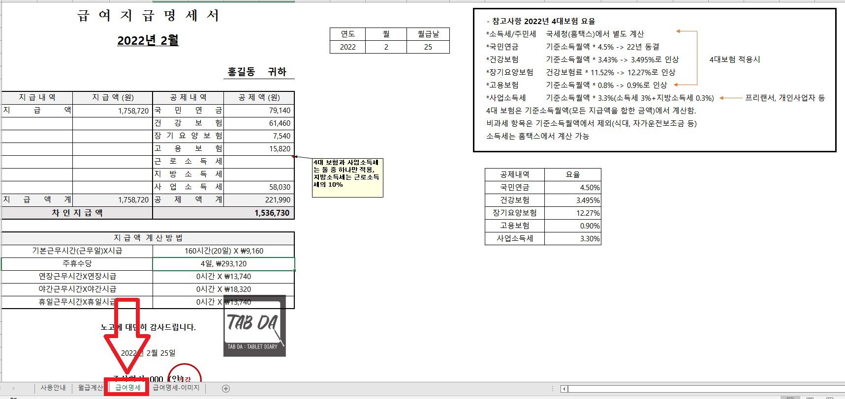 공제내역에 4대보험 이외에도 사업소득세라는 항목을 넣어두었는데요. 근로자가 프리랜서, 개인사업자인 경우 4대보험을 가입하지 않고 사업소득세만 공제하고 지급하는 경우가 있어요. (근로자가 원해서 가입하지 않는 경우도 있긴 하지만, 원칙적으로는 일반 근로자라면 4대보험에 가입해야 함) 이런 경우에는 4대보험 항목을 지우시고 사업소득세 3.3%만 공제하시면 됩니다. 물론 4대보험을 공제하면 사업소득세는 삭제해주시고요.