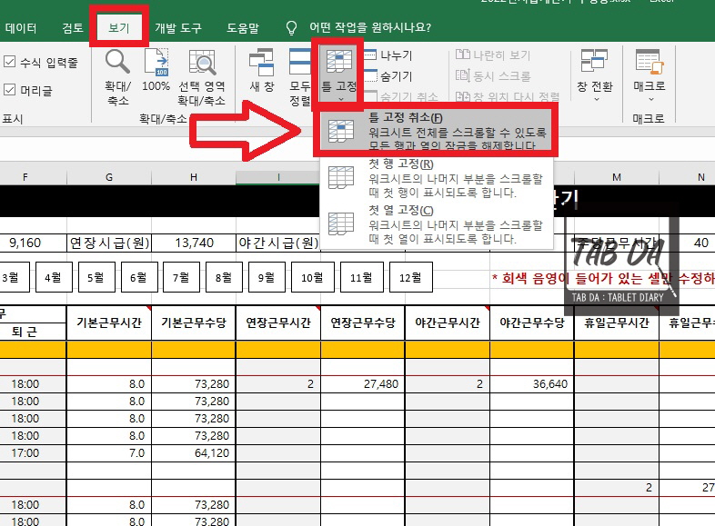 틀 고정을 취소하고 싶으시면 상단 탭에서 보기 - 틀 고정으로 들어가서 틀 고정 취소를 클릭해주시면 됩니다.