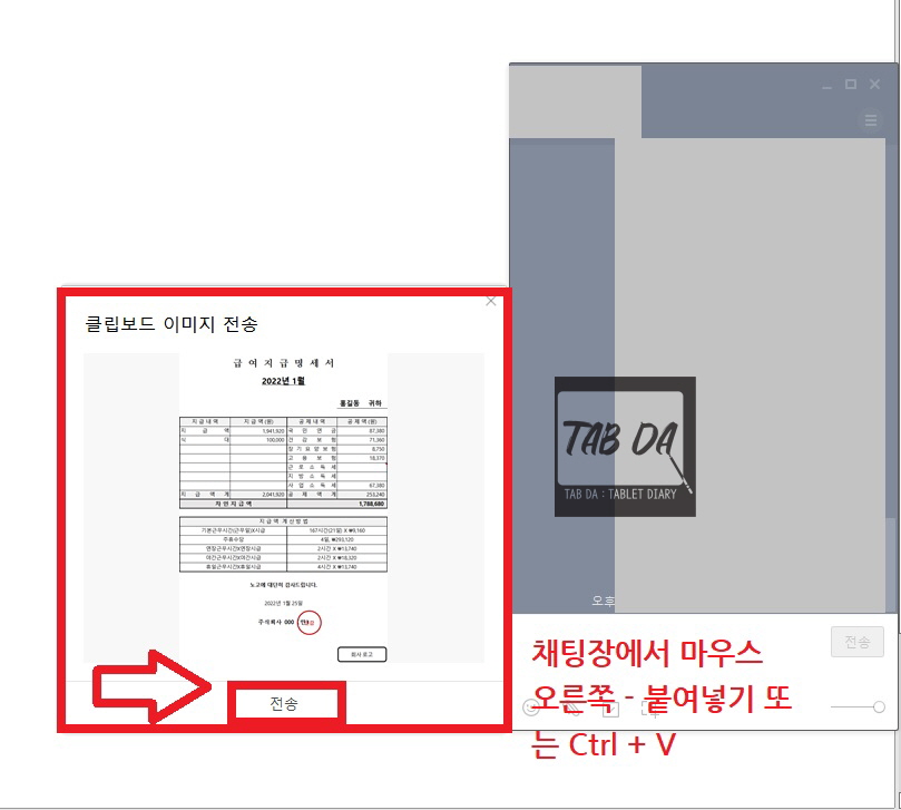 해당 이미지 위에서 '마우스 오른쪽 - 복사' 또는 'Ctrl+C'를 눌러 복사하신 뒤 PC카톡 대화창에 Ctrl+V를 눌러 붙여넣으시면 '클립보드 이미지 전송'이라는 팝업이 떠요. 전송을 누르면 바로 이미지가 보내집니다. pdf를 변환하는 것 보다 훨씬 간단하죠?
