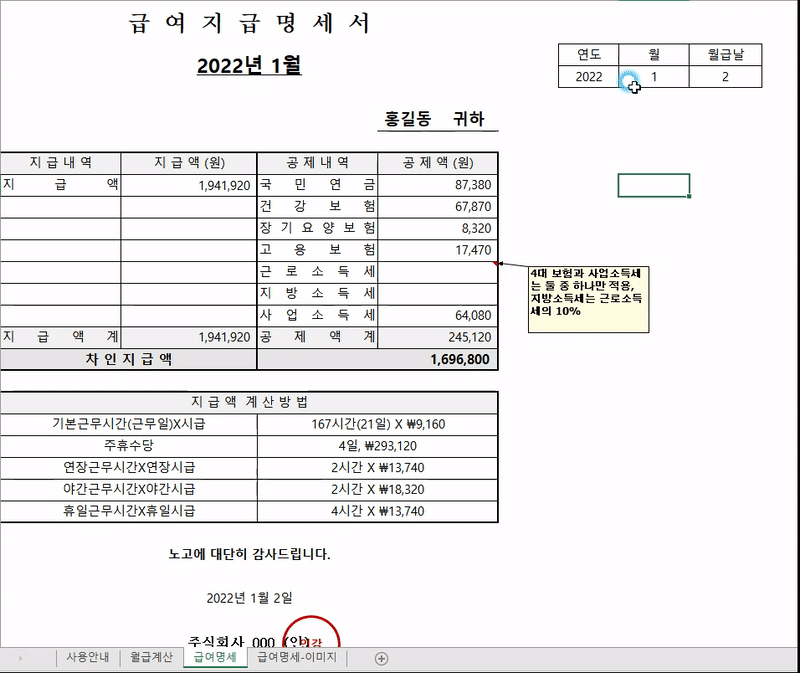 '월급계산' 시트에서 정확한 정보를 작성했다면 '급여명세' 시트에서는 크게 어려운 부분이 없어요. 이름, 지급 내역, 지급액 계산방법 등 필수적으로 들어가야 하는 정보들 대부분이 월급계산 시트에서 연동되어 자동으로 계산되거든요.