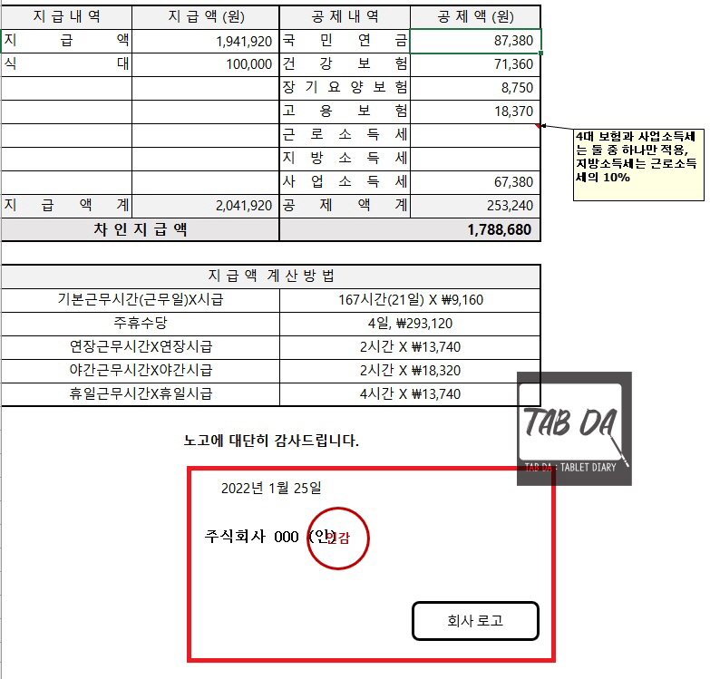 여기까지 '월급계산' 시트에 대한 설명이었어요. 혹시나 수식이 틀린 부분이 있을까봐 근로기준법, 행정 해석 등을 첨언하느라 포스팅이 길어졌네요. 이제 '급여명세' 시트로 넘어가볼게요~😃