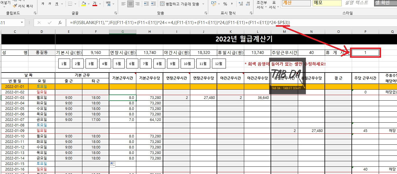 위 화면에 보이는 부분이 G열 '기본근무시간'에 들어간 수식이에요. 휴게시간 관련해서 수동으로 수정해야 할 부분이 있다면, 위 수식에서 $P$3 부분을 수정해주시면 돼요. 휴식이 없었다면 삭제하고, 휴식시간이 다르다면 다른 숫자로 대체해주세요.