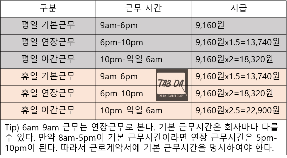 휴일에 일하면 기본 시급의 1.5배를 주게 되어 있고, 휴일에 연장 근무를 했을 경우 2배, 휴일에 야간 근무를 했을 경우는 2.5배를 지급하도록 되어 있습니다. 여기에서는 휴일 연장, 야간은 제외하고 휴일 기본 근무(9:00-18:00)만을 포함하였습니다.