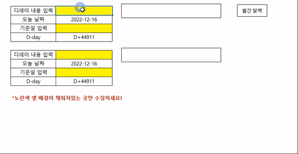다음은 디데이 시트입니다. 디데이 시트에서는 노란색 배경이 있는 셀만 채워주세요. 내용을 입력한 뒤, 디데이를 계산하고 싶은 날짜를 넣어주면 자동으로 남은 일자를 계산해줍니다. 기준일이 오늘 날짜보다 이전이라면 D+day로 표시돼요. 2개까지 입력하실 수 있고, 내용은 달력에서도 확인 가능합니다.