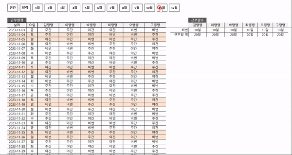 지금은 12월인데, 1월 근무를 보고 싶다면? 힘들게 스크롤을 올릴 필요가 없어요. 상단에 있는 월별 버튼을 클릭하면 해당하는 월의 1일로 바로 이동할 수 있습니다. 그리고 매월 1일 오른쪽에서는 각자 월 근무를 며칠이나 했는지 계산해주는 근무 일수 표를 보실 수 있어요.