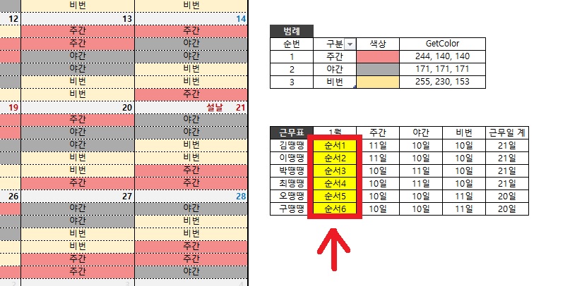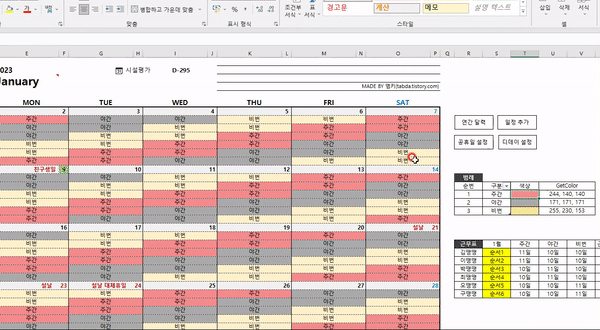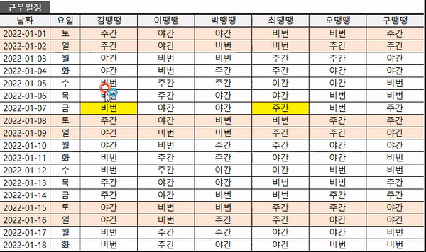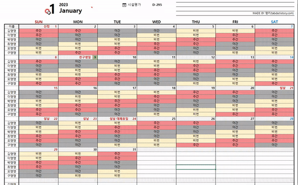 범례를 보시면 주간은 붉은색, 야간은 회색, 비번은 노란색으로 구분되어 있는데요. 해당 색으로 셀 배경이 칠해지도록 조건부 서식을 걸어두었어요