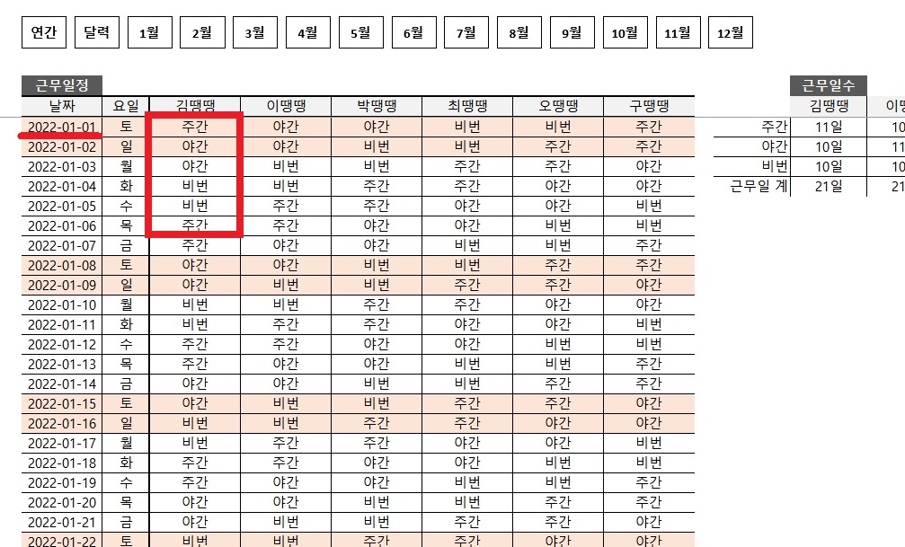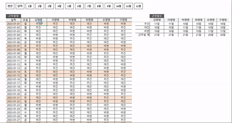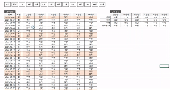 일정 시트에는 1년치 근무 일정이 수식에 따라 미리 넣어져있어요. 주주야야비비 일일이 넣지 않아도 돼요. 상단은 틀 고정을 해두어서 스크롤을 아래로 내리더라도 첫 번째 행이 계속 표시되고 있죠.