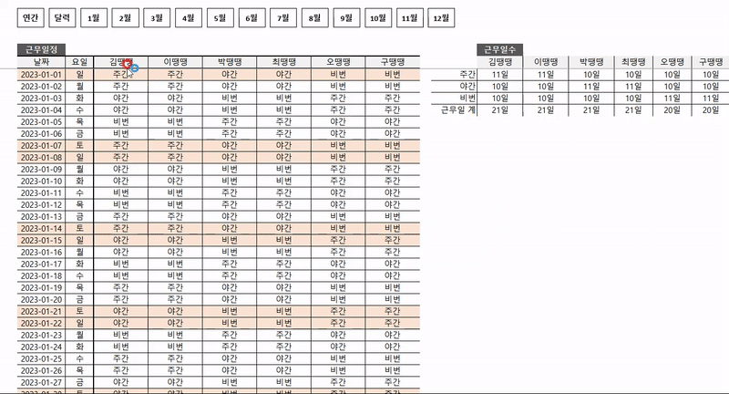 이런 식으로 한번만 근무 순서를 맞춰서 넣어주시면 특별한 사정 때문에 근무를 바꾸는 경우를 제외하고, 일일이 입력하지 않아도 되는 편리한 근무표가 만들어져요.