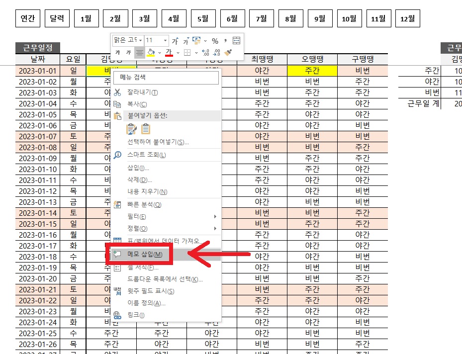 근무가 바뀌었다면 직접 수정해주세요. 만약 김땡땡씨가 1월 1일에 쉬게 된다면 그날 쉴 예정이었던 다른 사람이 김땡땡씨 대신 근무를 해주어야겠죠. 김땡땡씨는 비번으로 수정하고 오땡땡씨를 주간 근무로 교체해줍니다. 오른쪽에 있는 근무일수도 자동으로 바뀌는 것을 볼 수 있어요. 원래 패턴과 달라져서 수정이 된 날은 노란색 배경이 칠해지도록 했어요. 메모까지 넣어주면 더 좋겠죠.