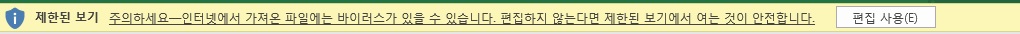 인터넷에서 엑셀 파일을 다운받으면 100% 확률로 제한된 보기 알림바가 뜹니다. "편집 사용"을 클릭해주세요. 클릭했더니 이번에는 좀 더 위험해 보이는 빨간색 알림바가 뜹니다. 매크로가 포함된 파일이라 위험하다고 인식하는 것 같습니다. 이럴 때 해결방법입니다.