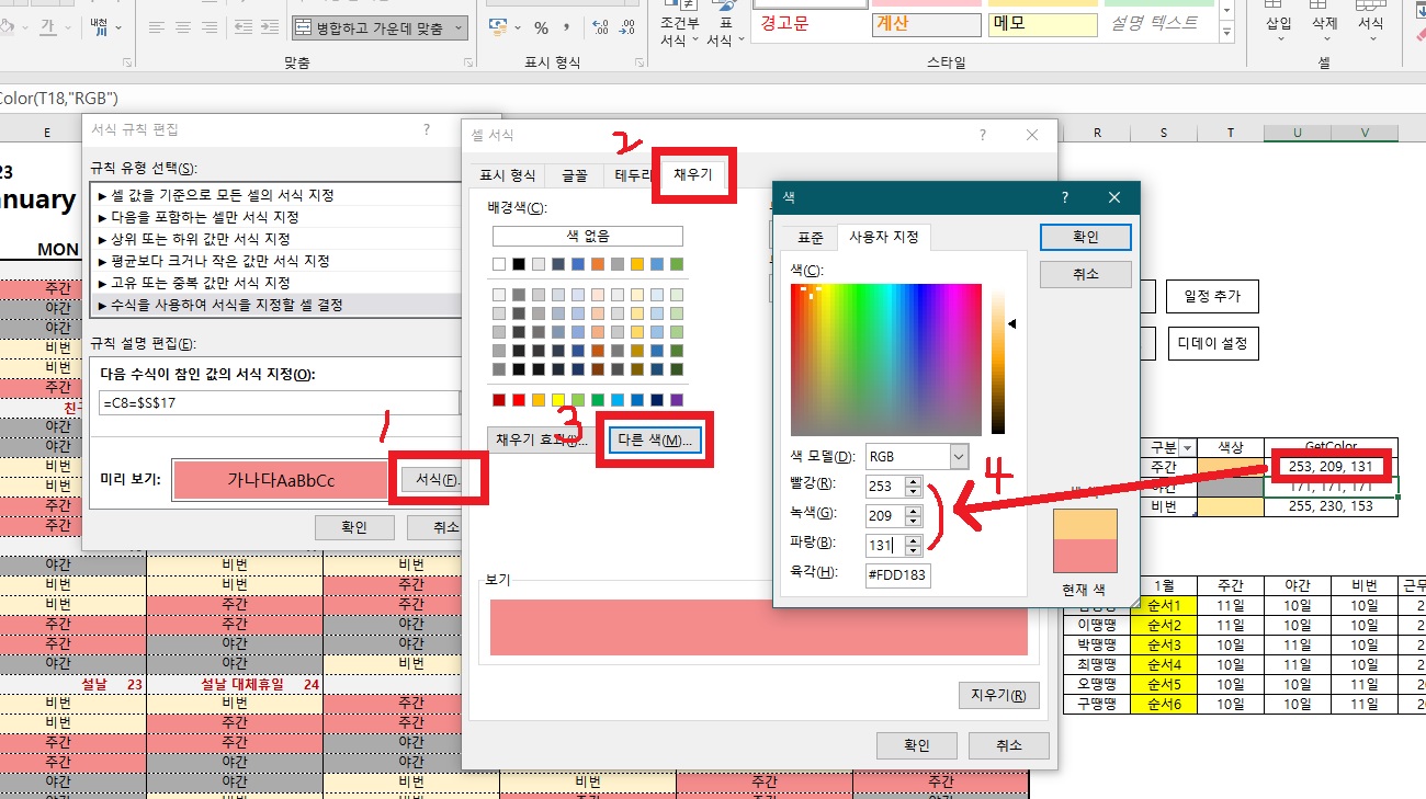 그 옆에는 GetColor 수식이 보이시죠. 셀 배경의 색상값을 알 수 있는 수식이에요. 그 색상값을 RGB(RED, GREEN, BLUE)라고 해요. 콤마(,)를 기준으로 나누어진 세 자리 숫자가 각각 빨강, 초록, 파랑을 뜻하죠. 이 수식은 기본 색상이 아닌 사용자 지정색을 넣고 싶을 때 유용하게 사용할 수 있어요.
