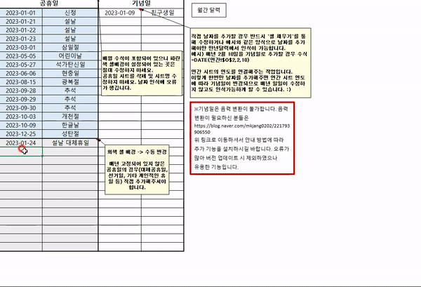 이전에 공유해드렸던 엑셀 만년 달력 Ver.6를 변형해서 만든 파일이기 때문에 아래 링크에서 설명을 먼저 보고 오시면 더 이해가 쉽습니다.