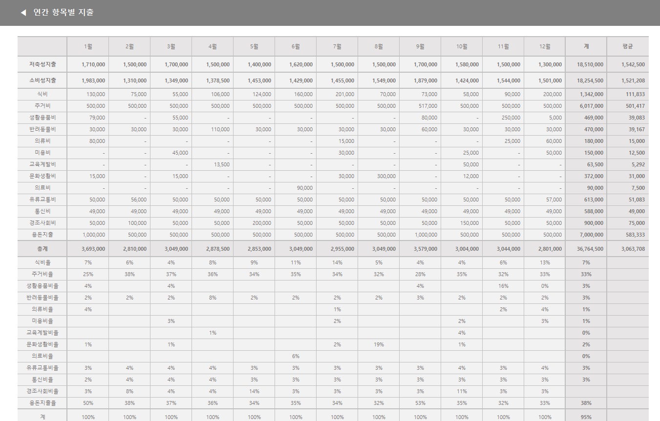 다음은 연간 항목별 지출 시트입니다. 항목별로 얼마나 지출했는지, 소비성지출은 각 항목의 지출 비율까지 자동으로 계산해 줍니다. 이 시트도 잘 활용하면 교육비, 의료비 등 연말 정산에 도움이 될 수 있어요.