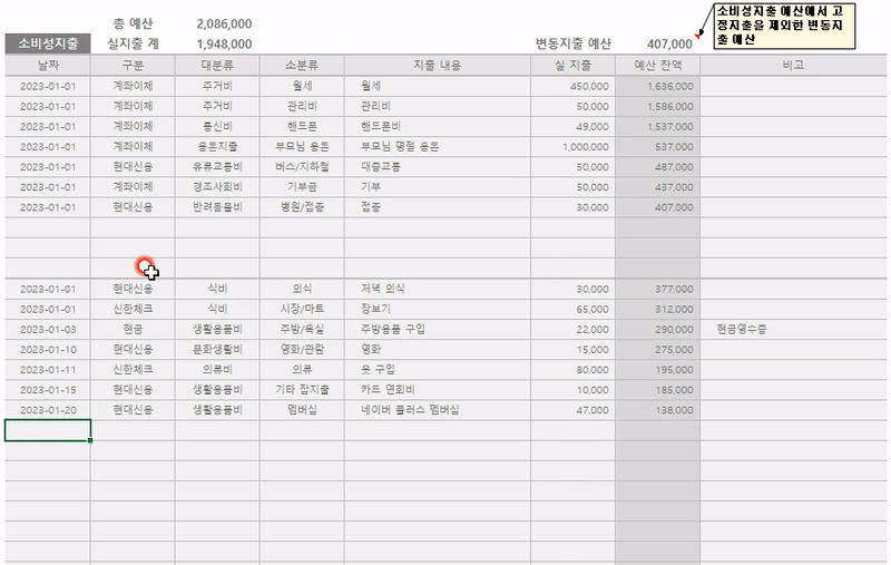 소비성지출 영역의 상단 10칸까지는 고정지출 작성칸이에요. 소비성지출에서 고정지출을 미리 빼두면 잔액을 통해 이번달 변동지출로 얼마나 쓸 수 있는지가 바로 계산되니까 지출할 때 참고할 수 있어요. 그래서 변동지출을 적기 전에 미리 고정지출을 적어주는 거예요. 변동지출 예산은 고정지출 작성칸 아래부터 반영돼요.