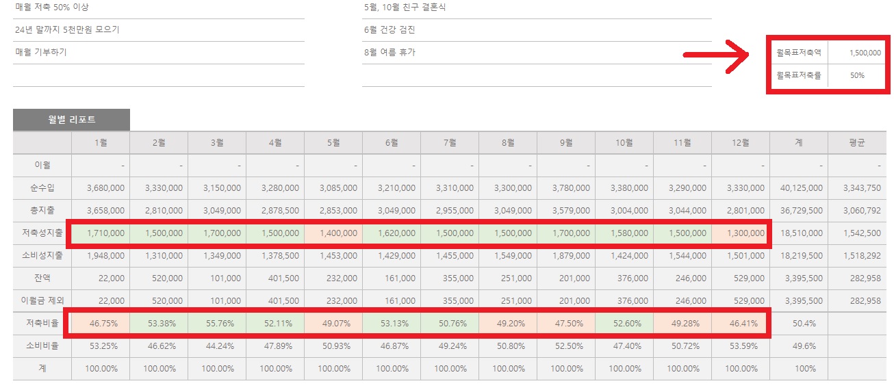 저축성 지출과 저축 비율에는 조건부 서식을 넣어서 설정한 숫자 이상이 되면 셀 배경이 칠해지도록 했습니다. 저는 2022년에 월 200만원 이상, 저축비율 60% 이상 됐을 때 초록색으로 셀 배경이 채워지도록 설정해놓고 사용했는데요. 목표치를 수정하시려면 숫자만 변경해주시면 됩니다.