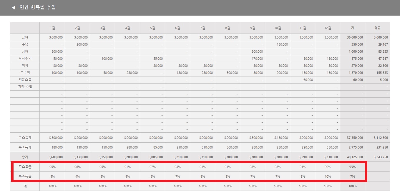 주수입에는 급여, 수당, 상여 등이 포함되고, 나머지는 부수입으로 들어가요. 이 부분은 수정할 수 없으니까 항목을 나눌 때 주수입으로 계산하고 싶은 수입은 급여, 수당, 상여라는 문구가 포함되도록 항목 이름을 적어주세요.