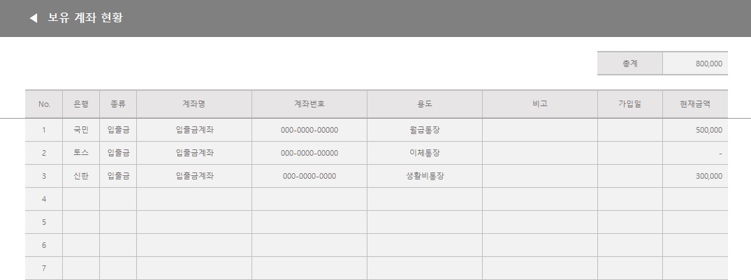 계좌현황 시트를 살펴볼게요. 계좌현황 시트에는 현금, 입출금, 만기가 없는 투자 상품, 자유적금 등의 계좌 정보를 입력해주시면 됩니다. 현재 금액을 입력해 주면, 총액을 계산하여 자산현황 시트의 단기 금융자산에 자동으로 반영돼요. 계좌현황에는 총 20개의 계좌를 입력할 수 있어요.