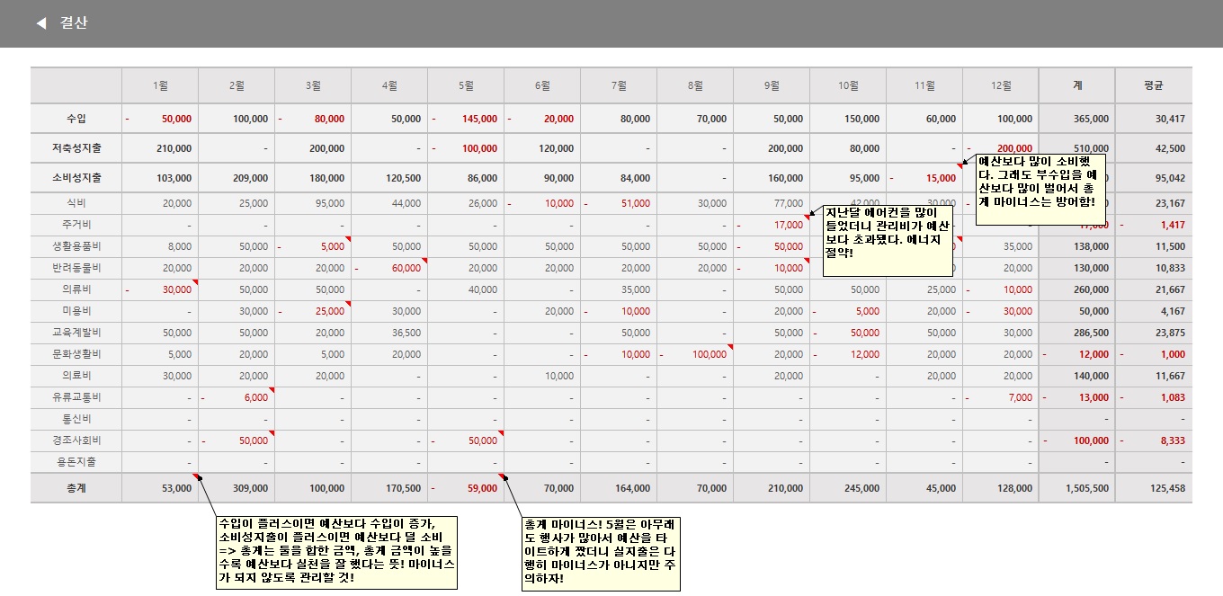 마이너스된 항목을 위주로 어디에 예산보다 많이 지출했나를 살펴보세요. 그리고 마이너스 항목에는 꼭 메모를 넣어두세요. 예산보다 많이 지출한 원인을 적어둬야 개선이 가능하니까요. 충동구매를 한 건지, 정말 어쩔 수 없는 지출이었는지 솔직하게! 예시를 보면 경조사회비에서 유독 마이너스가 크고, 의류비는 많이 남았네요. 그러면 '아 내년에는 예산에서 의류비를 줄이고 경조사회비를 좀 더 추가해야겠구나.'라고 생각할 수 있는 거죠. 결산 분석을 통해서 좀 더 체계적인 예산 설정이 가능해집니다.