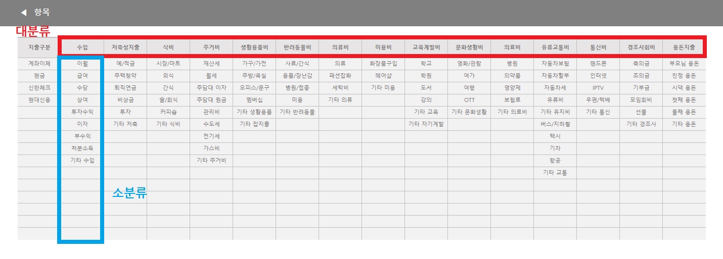 항목은 되도록 월별 내역을 작성하기 전에 확정해주세요. 중간에 수정하면 월별 내역에 넣었던 분류들도 일일이 바꿔줘야 하거든요.