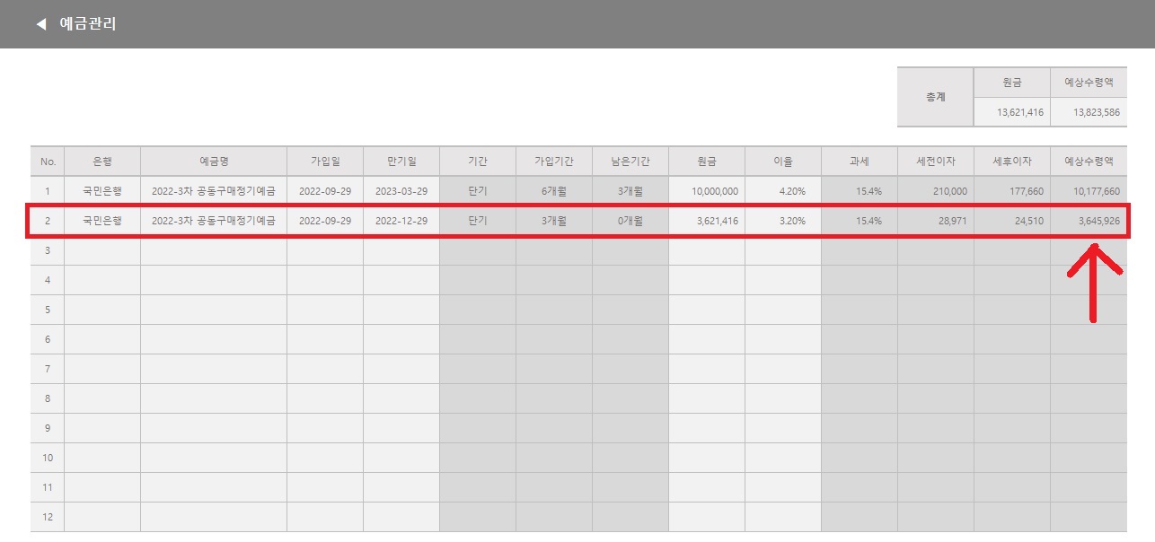 위 화면은 제가 "실제로" 사용하고 있는 예금관리 시트인데요. 얼마 전에 만기 된 따끈따끈한 예금 실수령액과 비교를 해봤어요.
