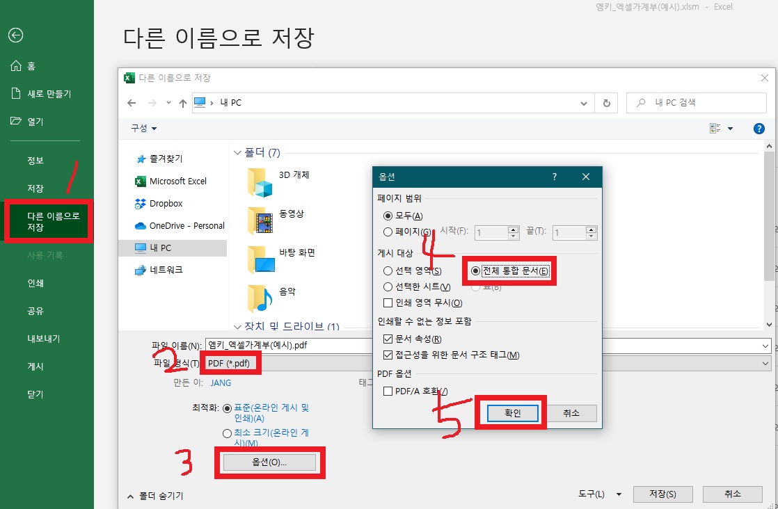 pdf파일로 저장하는 방법은 아주 쉬워요. 파일 - '다른 이름으로 저장'에 들어가서 파일 형식을 pdf로 선택해 줍니다. 그러면 아래쪽에 옵션 버튼이 생기는데요. 클릭해서 들어가면 전체 통합 문서를 선택해서 pdf로 저장할 수 있어요. 이렇게 저장해두면 1년 후에 다시 열어봤을 때 내용이 수정될 염려가 없겠죠!