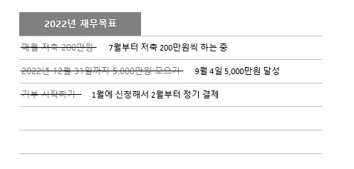 제가 "실제로" 썼던 가계부를 살짝 보여드리자면 2022년 제 목표는 5천만 원 모으기였고, 달성했습니다!🎉🎉 이렇게 가계부 첫 화면에 재무목표를 적어두면 자주 보면서 내 목표를 되새길 수 있습니다.
