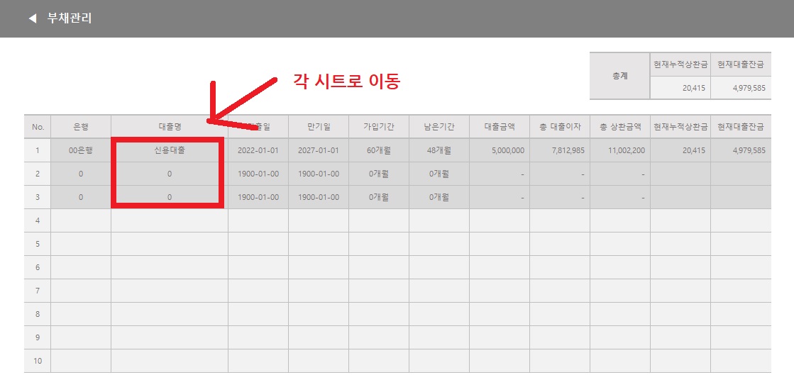 이제 정말 정말 마지막 시트입니다. 부채관리 시트예요. 예적금과는 달리 여기에서 직접 입력하는 것이 아니라 이름을 클릭하면 이동하는 상세 시트에 정보를 넣어주세요.