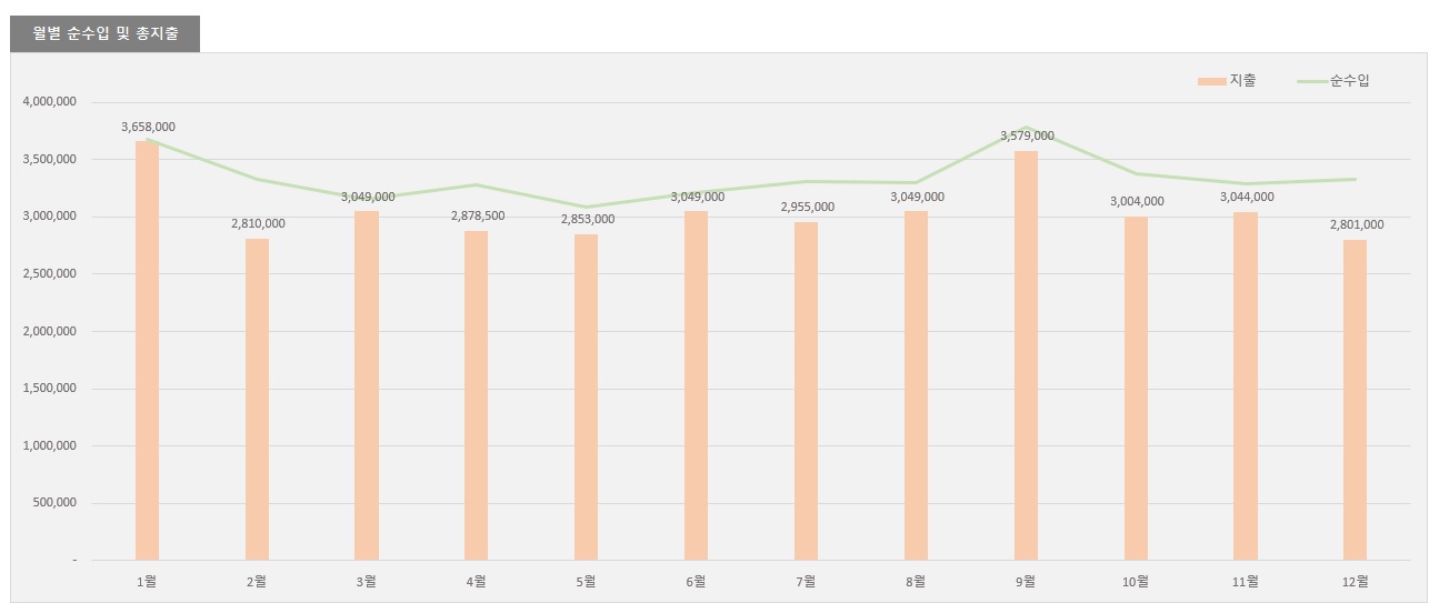 메인에서 아래쪽으로 내려가면 일년 동안의 수입 지출 통계를 차트 그래프로 볼 수 있도록 했습니다. 이월 금액이 있는 경우에는 이월 금액을 빼고 그달의 순수입만 계산합니다. 수입은 초록색 선 그래프를 보시면 되고, 지출은 막대그래프를 보시면 됩니다. 당연히 막대그래프가 선 그래프를 추월하는 일이 없어야겠죠?