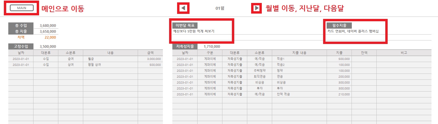다음은 월별 수입, 지출 내역을 작성할 수 있는 시트입니다. 1월부터 12월까지 미리 만들어져 있어요. 가장 위쪽에는 월별 목표를 작성할 수 있는 칸이 있고 목표 오른쪽에는 필수지출 영역이 있는데요. 언제 지출할지 정확하지 않지만 이번 달에 나갈 예정인 금액을 미리 적어놓고 지출할 때 반영하는 방법을 사용하고 있습니다. 예를 들어 '이번달은 강의비로 5만 원이 무조건 나가니까 지출할 수 있는 예산에서 5만 원은 제외하고 생각하자'라고 지출 계획을 세울 수 있는 거죠.