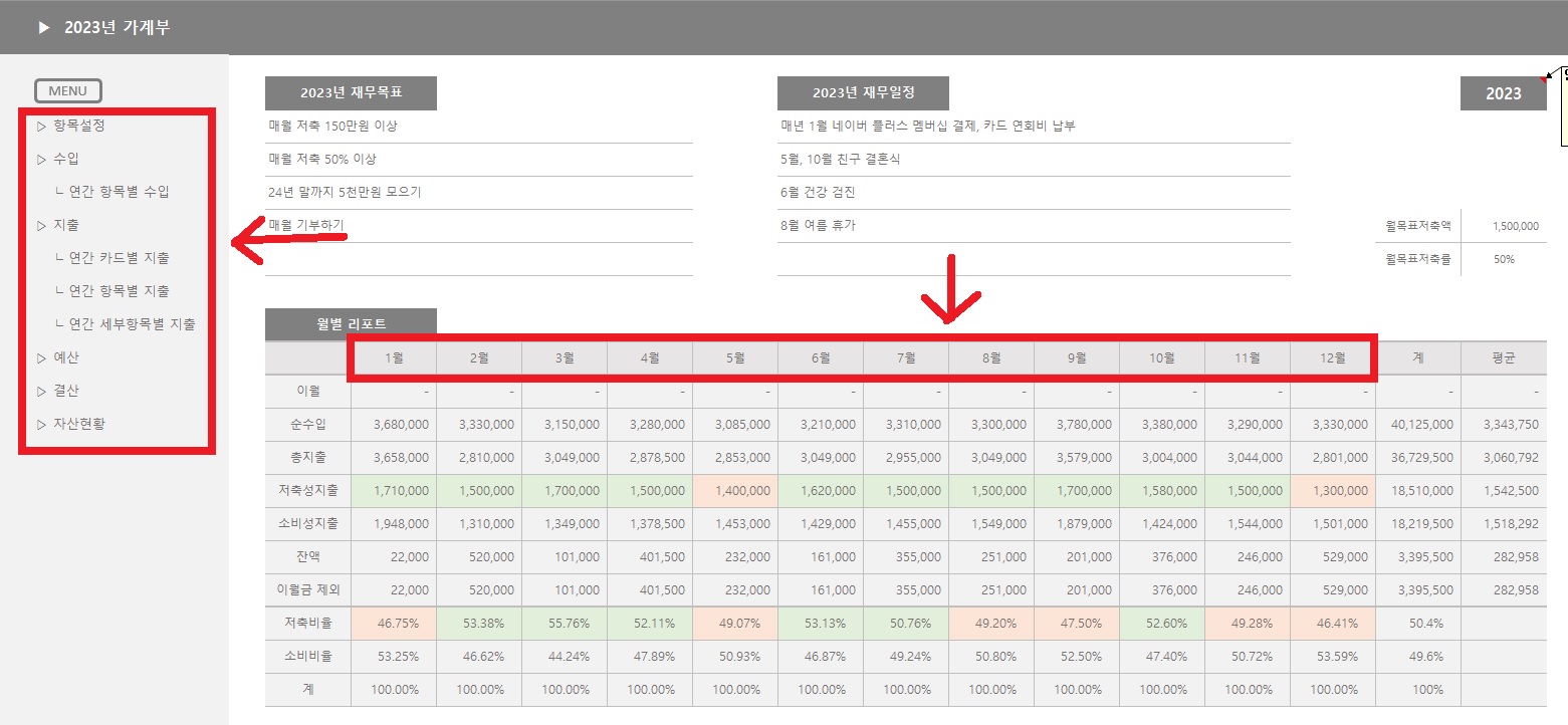 왼쪽 메뉴 화면과 1월부터 12월까지는 하이퍼링크가 적용되어 있어서 클릭하면 해당 시트로 이동합니다. 시트가 많기 때문에 하단 탭에서 모든 시트를 한눈에 볼 수 없는데, 이렇게 하이퍼링크로 이동하면 상당히 편해요. 익숙해지면 스크롤로 넘겨가면서 일일이 찾는 것보다 훨씬 빠릅니다.