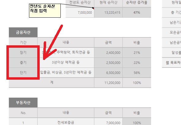 금융자산은 장기, 중기, 단기로 나누어서 현재 융통 가능한 자산이 얼마 정도인지 한눈에 파악할 수 있도록 했어요.