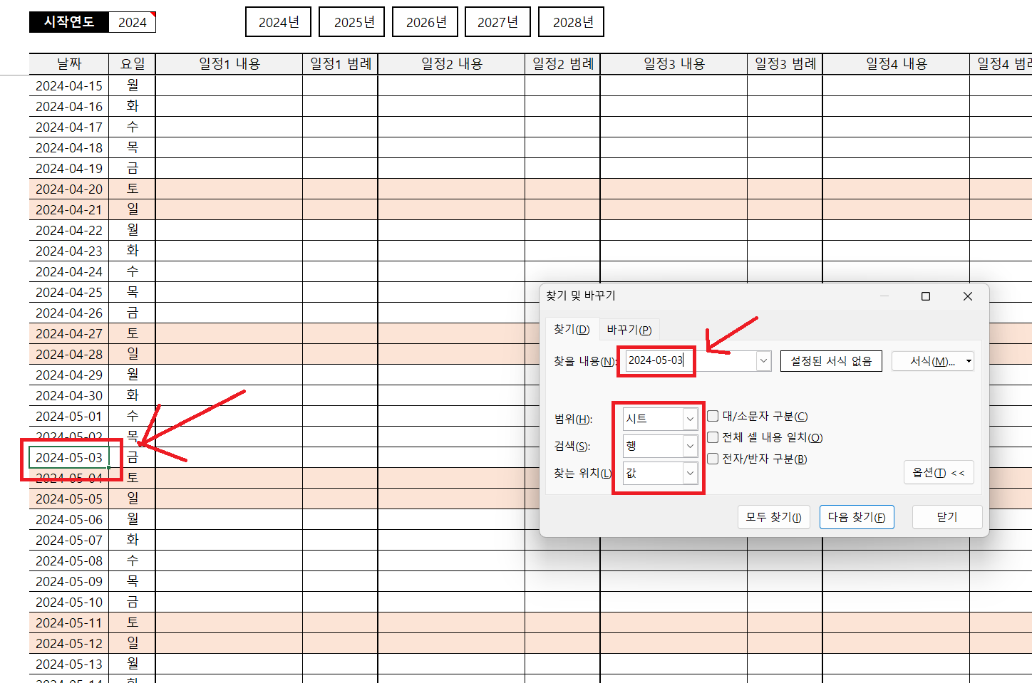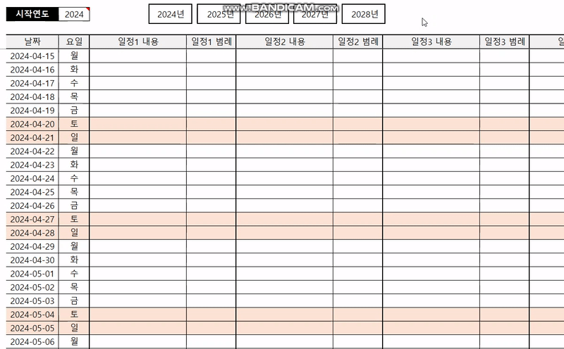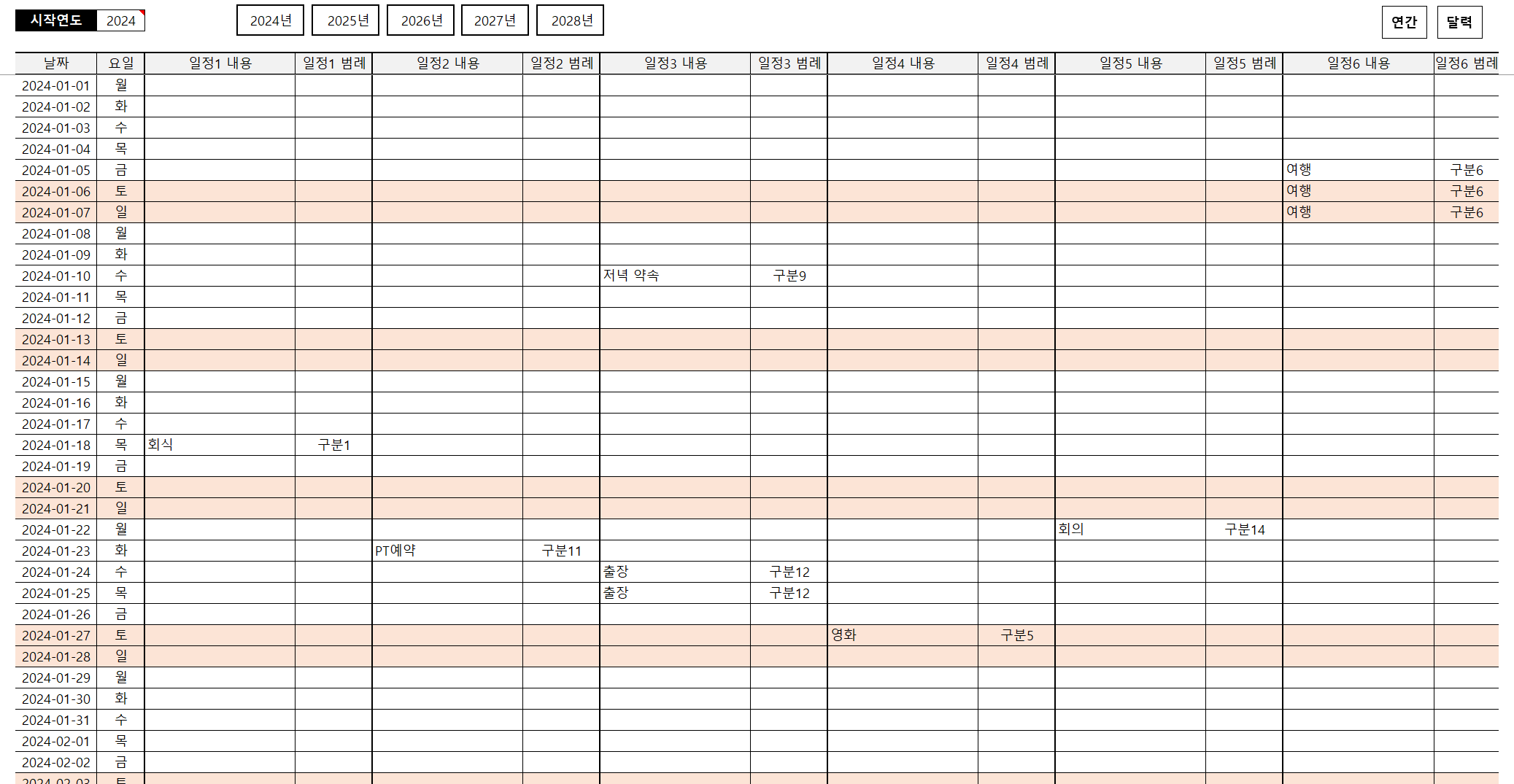 시작연도는 직접 수정해주세요. 2024를 넣으면 2024년부터 5년간의 일정을 입력할 수 있습니다. 그럼 2025를 넣으면 25, 26, 27, 28, 29 이렇게 5년이 나오겠죠? (숫자만 입력해주세요)