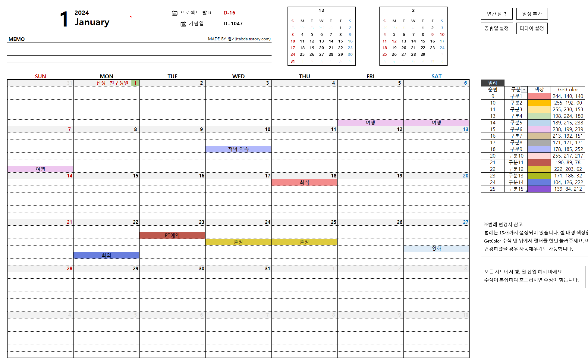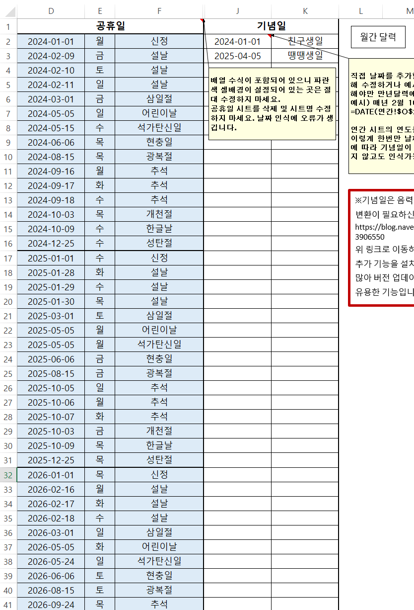 + 중간부터 기념일이 반영되지 않는 오류가 있어 수정하였습니다. 수식이 빠져있었더라구요. 새로 파일을 다운받아서 사용해주시면 감사하겠습니다ㅜ 제보해주셔서 감사합니다👍