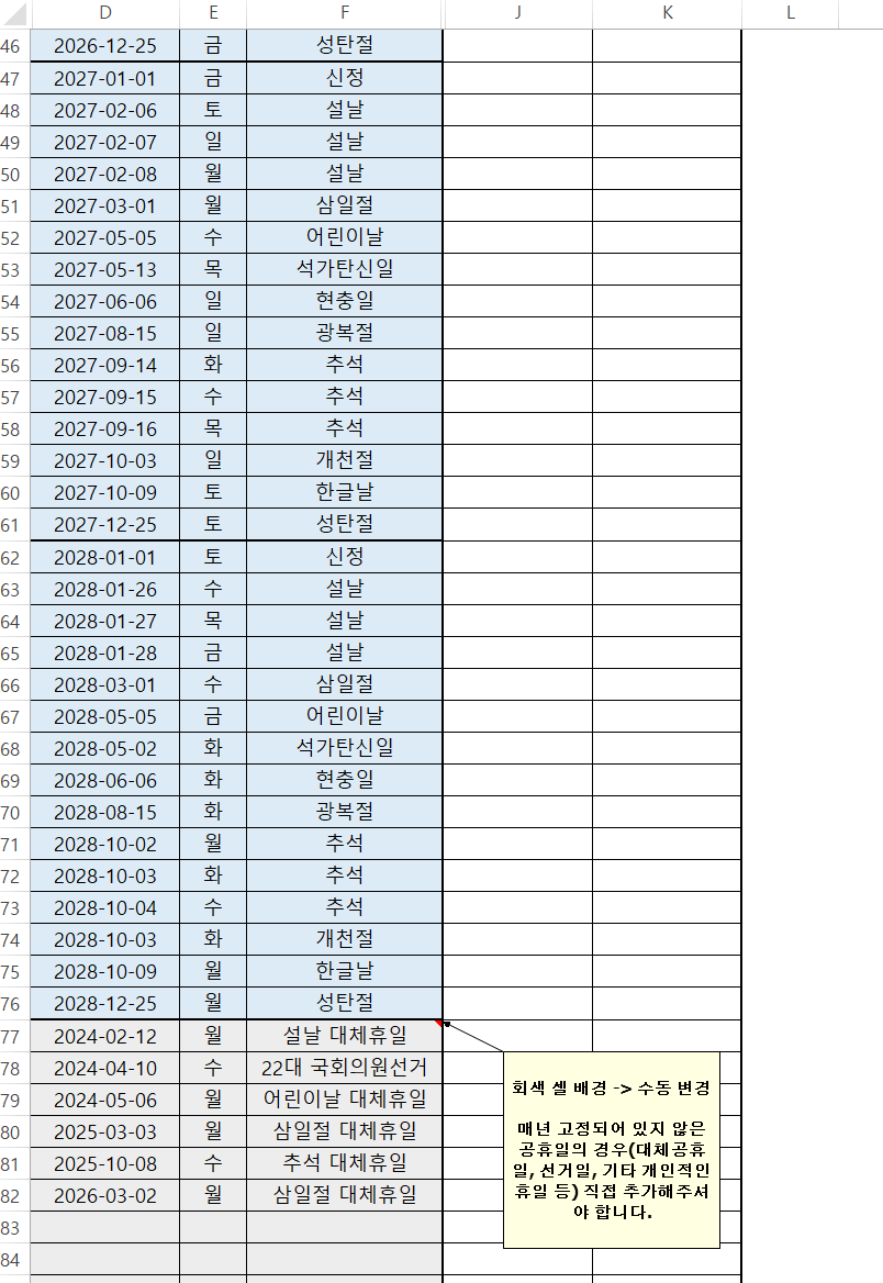 대신 대체휴일이나 선거, 개인적인 휴일처럼 매년 고정되어 있지 않은 휴일은 회색 셀 배경 영역에 직접 추가해주시면 됩니다. 지금까지 알고 있는 대체휴일 정보는 네이버 달력에서 찾아서 넣어두었는데, 26년까지밖에 안 나오더라구요.