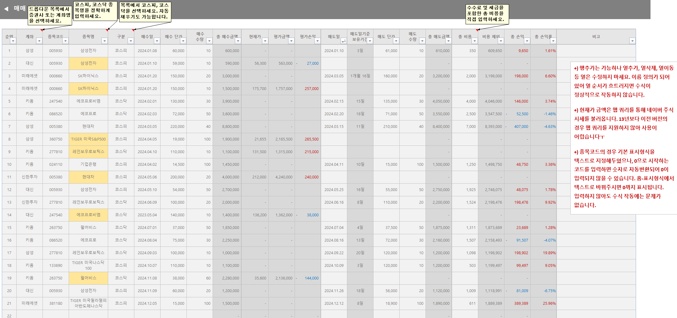 번거롭더라도 이렇게 해야 건별 실현 손익과 보유 수량을 직관적으로 계산할 수 있겠더라고요. 더 좋은 방법이 생각나면 다음 버전에 업데이트해 보도록 하겠습니다!