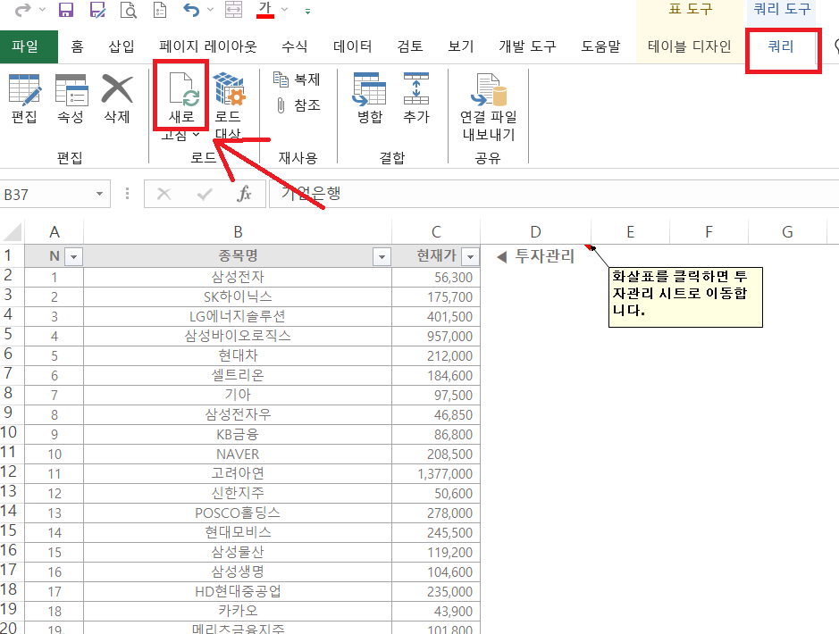 코스피 시세, 코스닥 시세 시트로 가면 상장되어 있는 모든 종목의 현재가를 보실 수 있습니다. 포스팅 날짜를 기준으로 최신화되어 있기 때문에 실시간 현재가를 보려면 새로고침을 눌러주셔야 합니다. 표 아무 데나 클릭 후 나타나는 상단 탭에서 쿼리 - 새로고침을 누르셔도 되고, 표 위에서 마우스 오른쪽 - 새로고침을 누르셔도 됩니다.