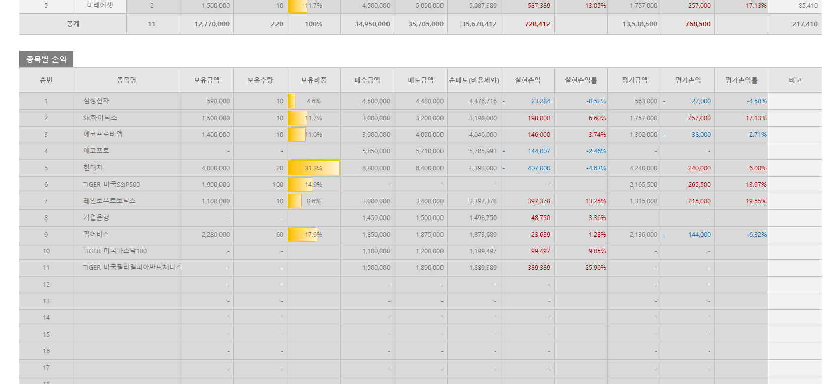 종목별 손익에서는 거래 계좌와 관계없이 해당 종목의 총 손익과 손익률을 보여줍니다. 동일 종목을 여러 계좌에서 매매하더라도 종목 전체의 총손익을 알 수 있는 것이죠. 마찬가지로 종목별 보유 비중을 그래프로도 볼 수 있습니다. 모두 매도하여 보유 수량이 없는 경우에는 보유 비중과 평가 손익이 공란이 됩니다.