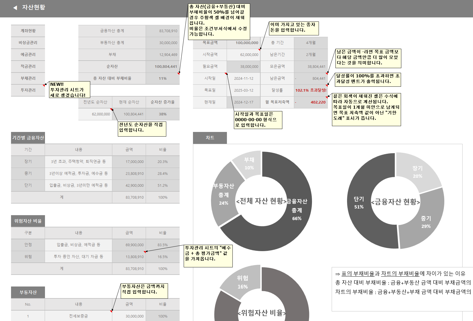메인 시트에서는 크게 변경된 부분이 없습니다. 포스팅을 다시 찾아보는 수고를 덜 수 있게 더 구체적인 설명과 자주 나오는 질문에 대한 답변을 시트 내에 메모, 텍스트 상자로 넣어두었습니다.