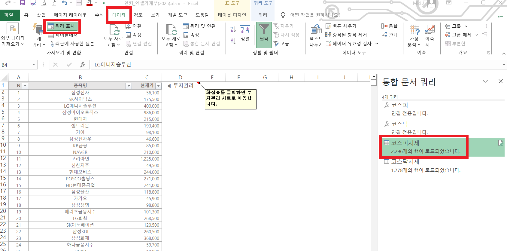 종목이 많기 때문에 새로고침에 시간이 꽤 걸립니다. 덜 지루하게 기다릴 수 있는 한 가지 팁을 드리자면, 데이터 - 쿼리 표시를 클릭해 보세요. 새로고침이 어디까지 진행됐는지 로드되는 과정을 보실 수 있습니다.😉