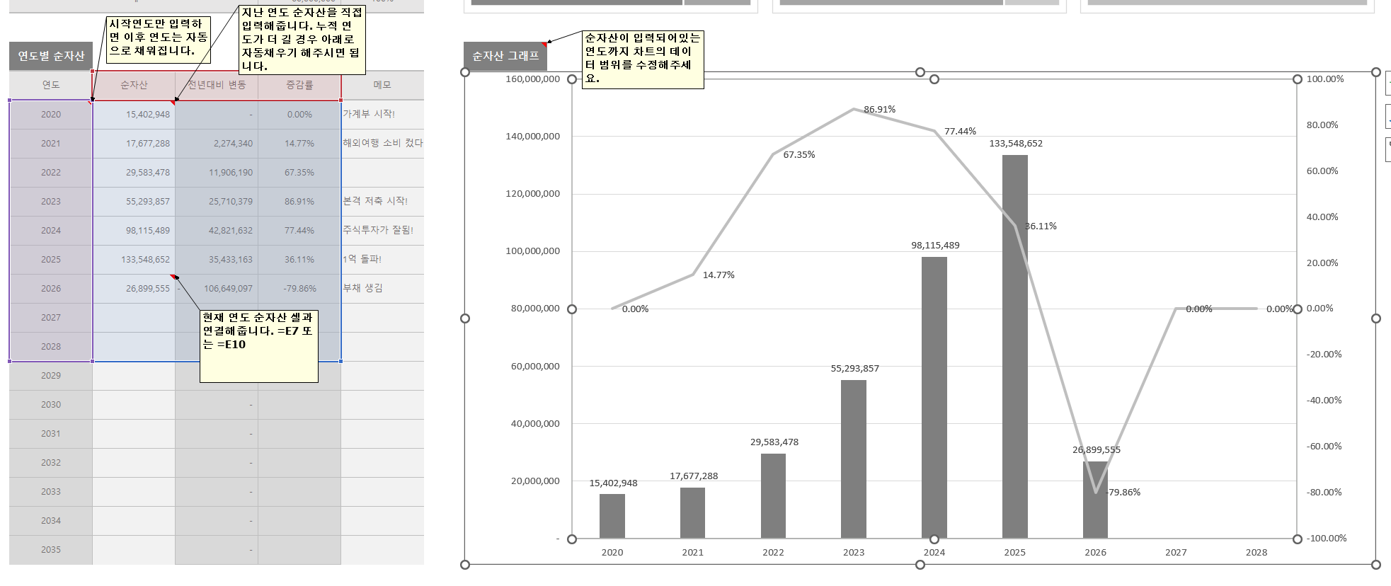 - 과거 연도별 순자산은 수기로 입력하고, 현재 자산은 셀 참조를 통해 실시간으로 반영되도록 설정해 두었습니다.