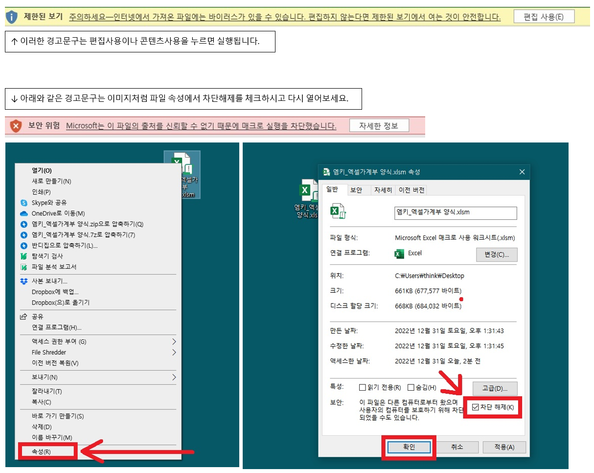 엑셀 파일에 매크로가 포함되어 있기 때문에 보안 프로그램이 자동으로 차단하는 경우가 많습니다. 바이러스가 있다면서 경고창이 뜰 수도 있습니다. 아무런 바이러스도 없으니까 안심하고 차단 해제하여 사용하시면 됩니다.