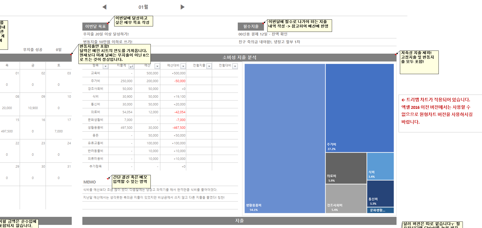 - 주의 : 트리맵 차트는 엑셀 2016 버전 이상부터 지원됩니다. 하위 버전을 사용 중이시다면 기존의 원형 차트를 사용하셔야 합니다.
