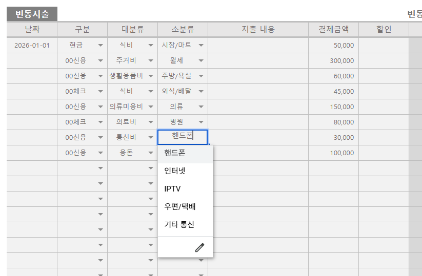 가장 구현이 까다로웠던 '대분류에 따른 소분류 드롭다운' 기능이 적용되었습니다. 반응 속도에 딜레이가 있으니, 목록이 제대로 뜨지 않을 경우 다른 셀을 클릭했다가 다시 시도해 보시길 바랍니다.