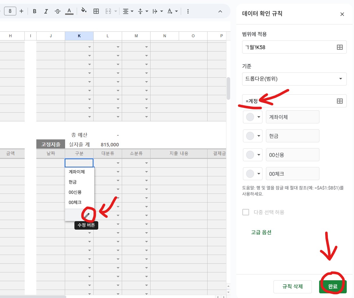 상단 이미지는 예시입니다. 잘려서 보이지 않는 드롭다운 목록의 가장 아래에 연필모양 아이콘을 클릭해 주세요.