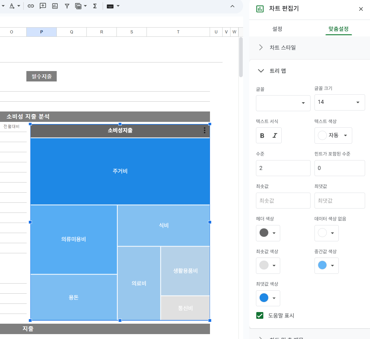 - 트리맵 차트 색상은 차트 우측 상단 '점 세 개 메뉴' > '차트 수정' > '맞춤설정'에서 변경 가능합니다.